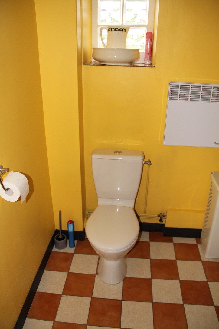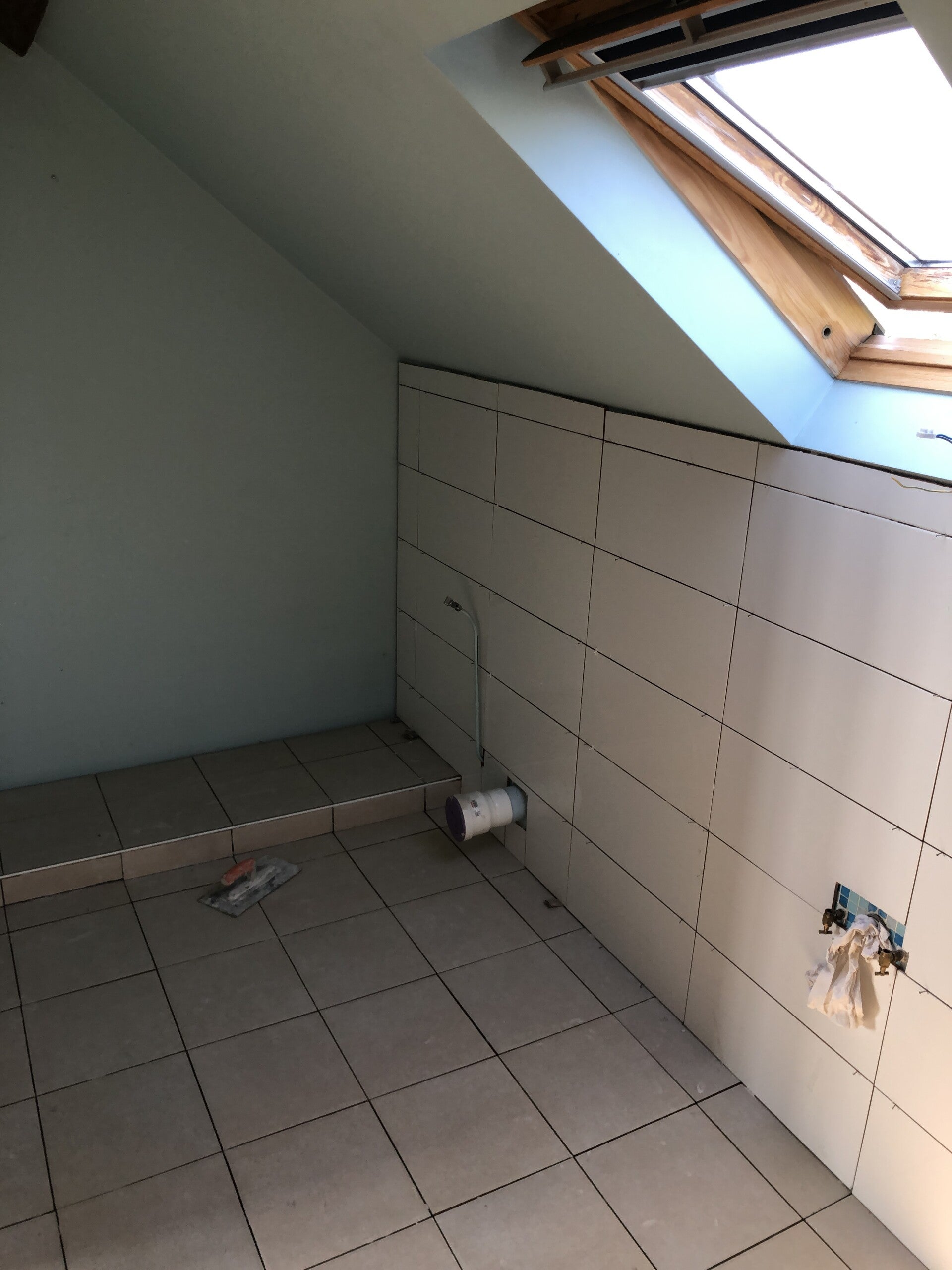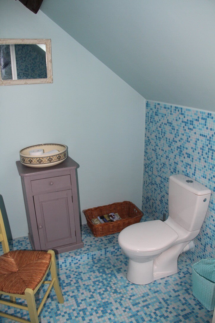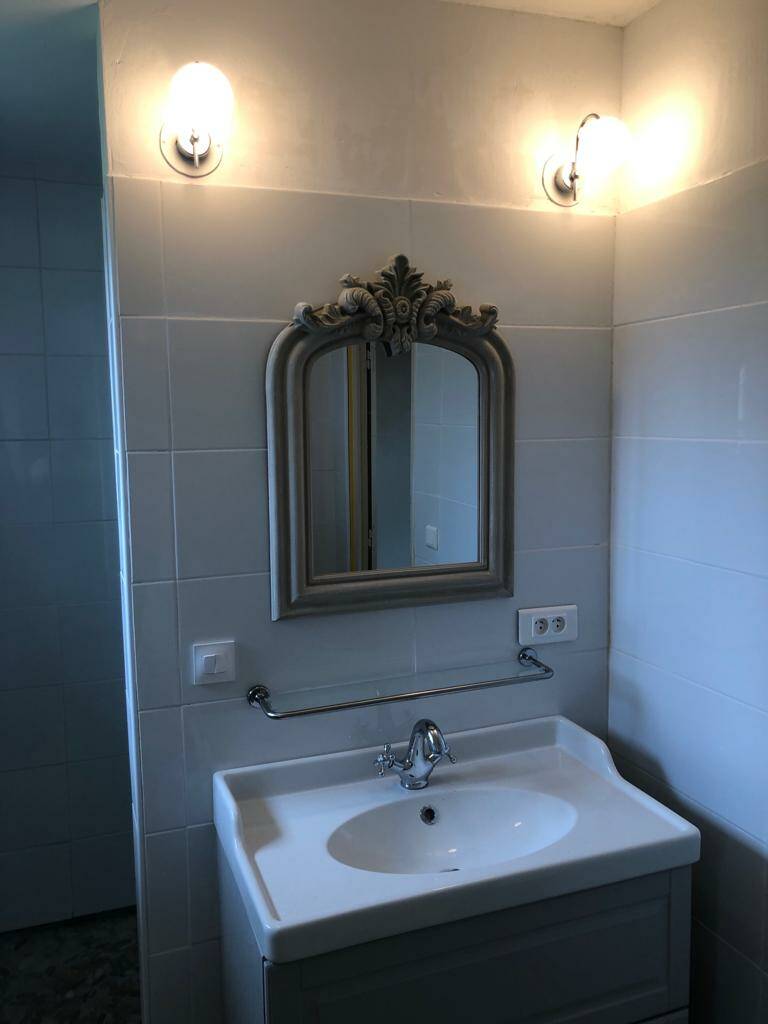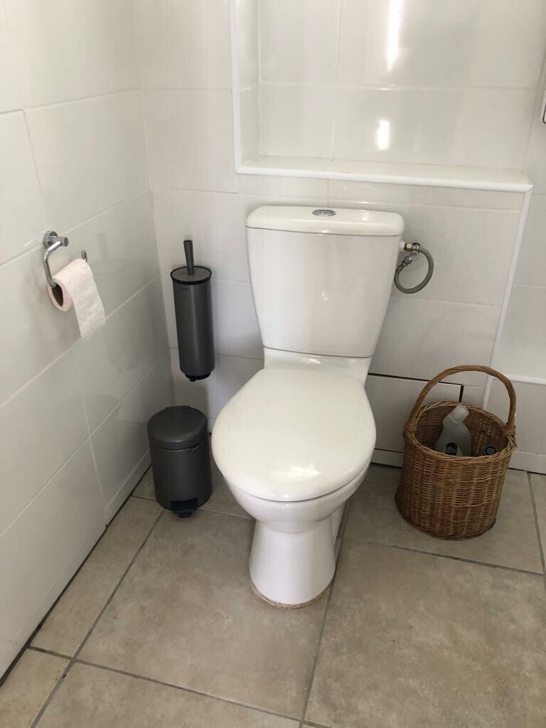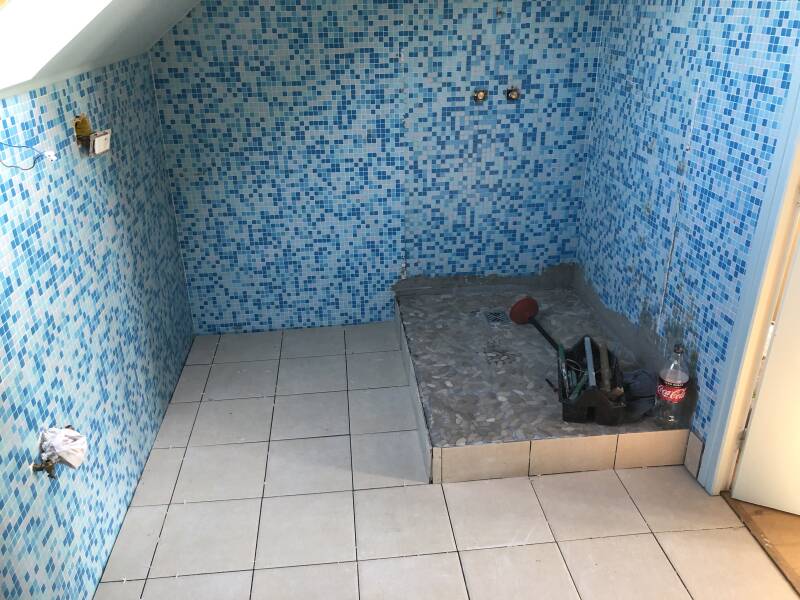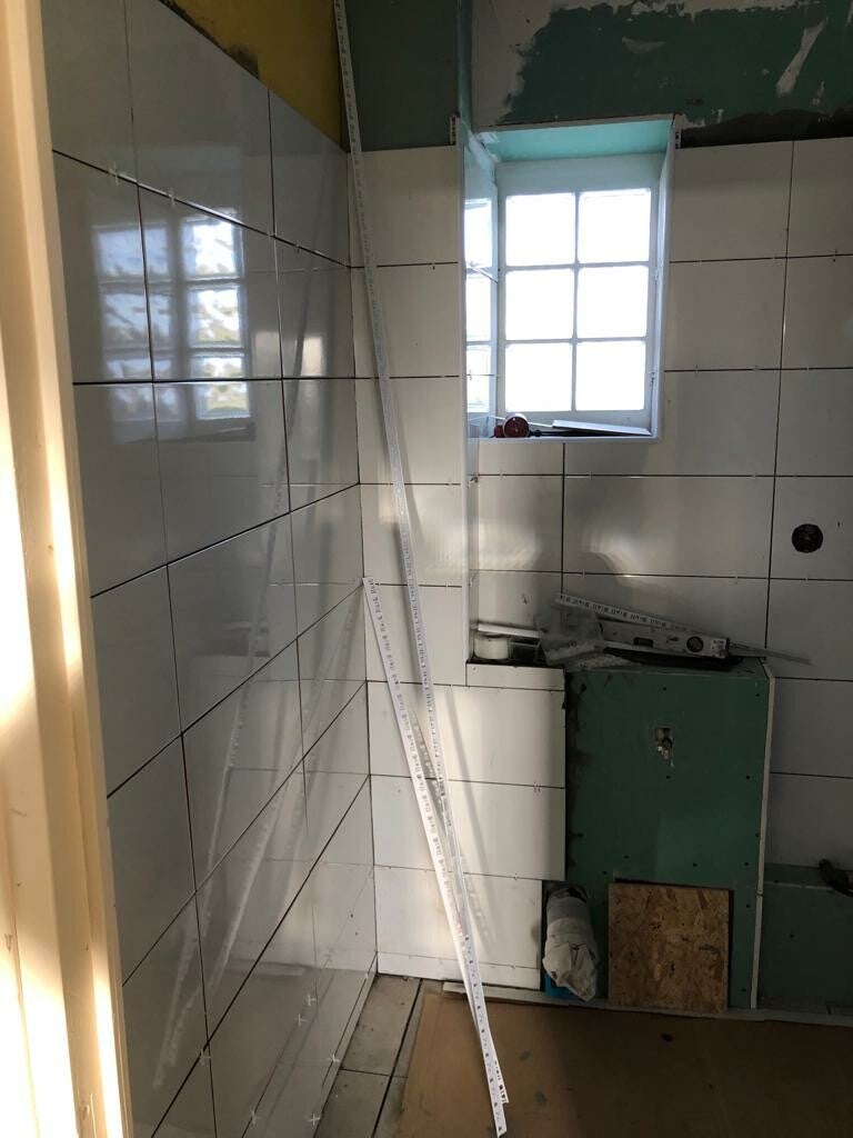 De badkamers waren alles behalve onze smaak, zacht geel en licht blauw. Ook hier maar mee aan de slag!