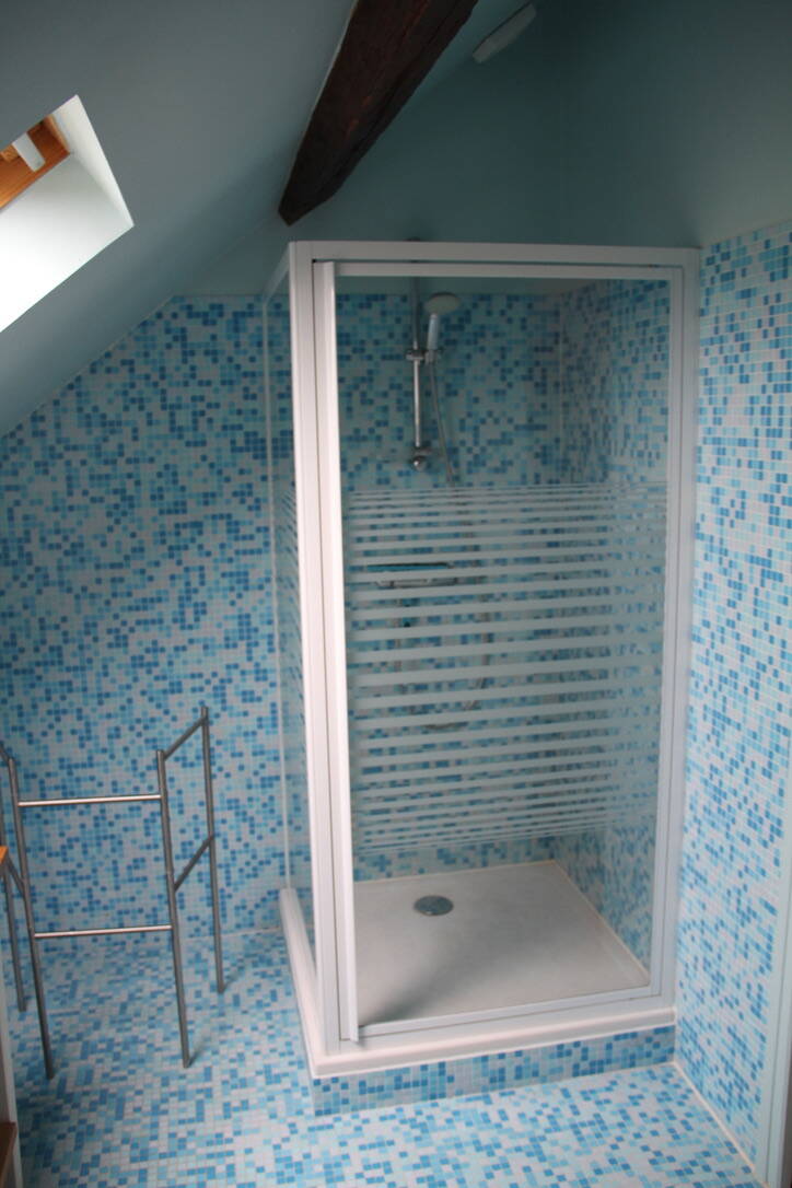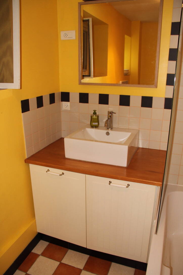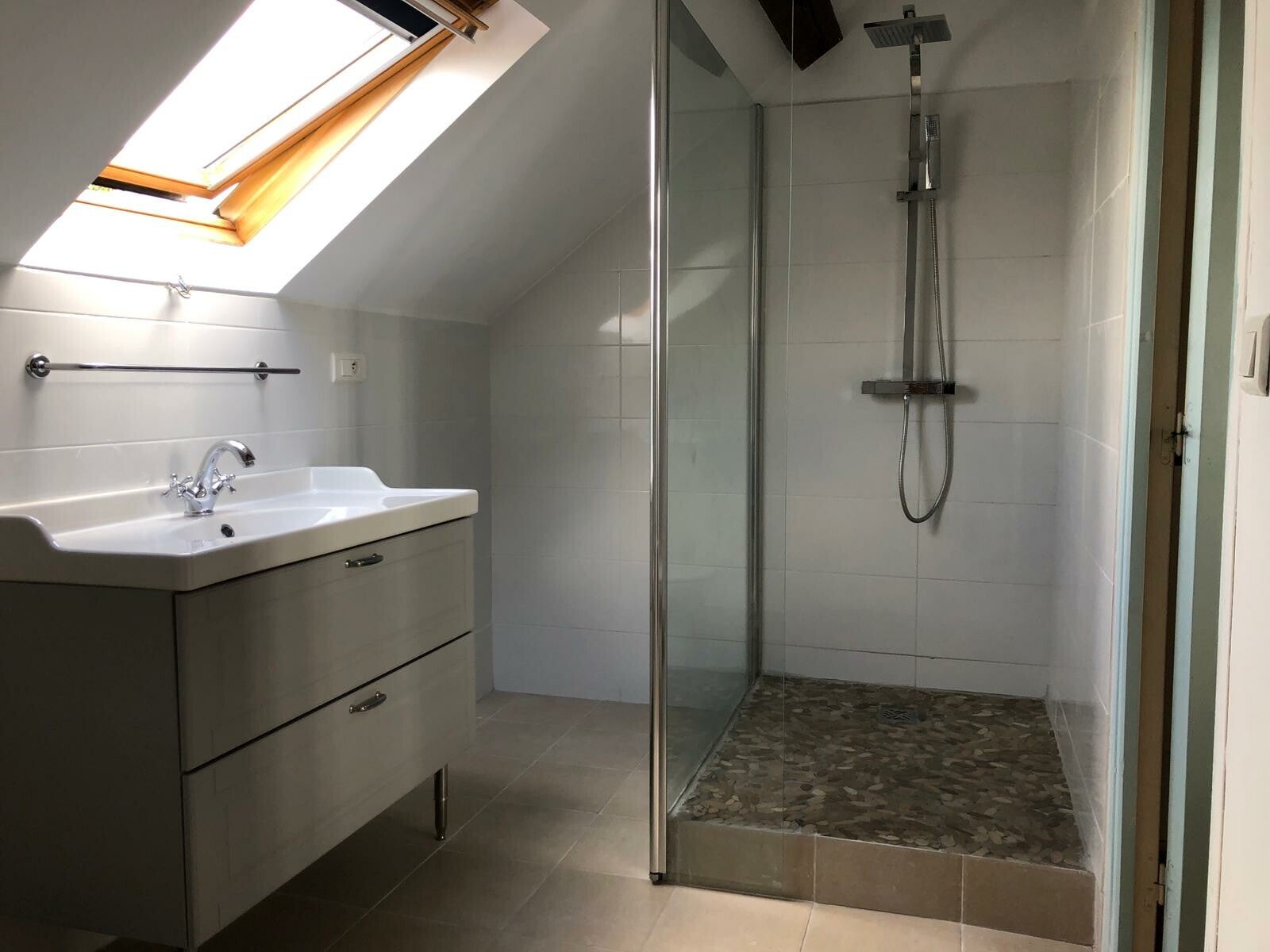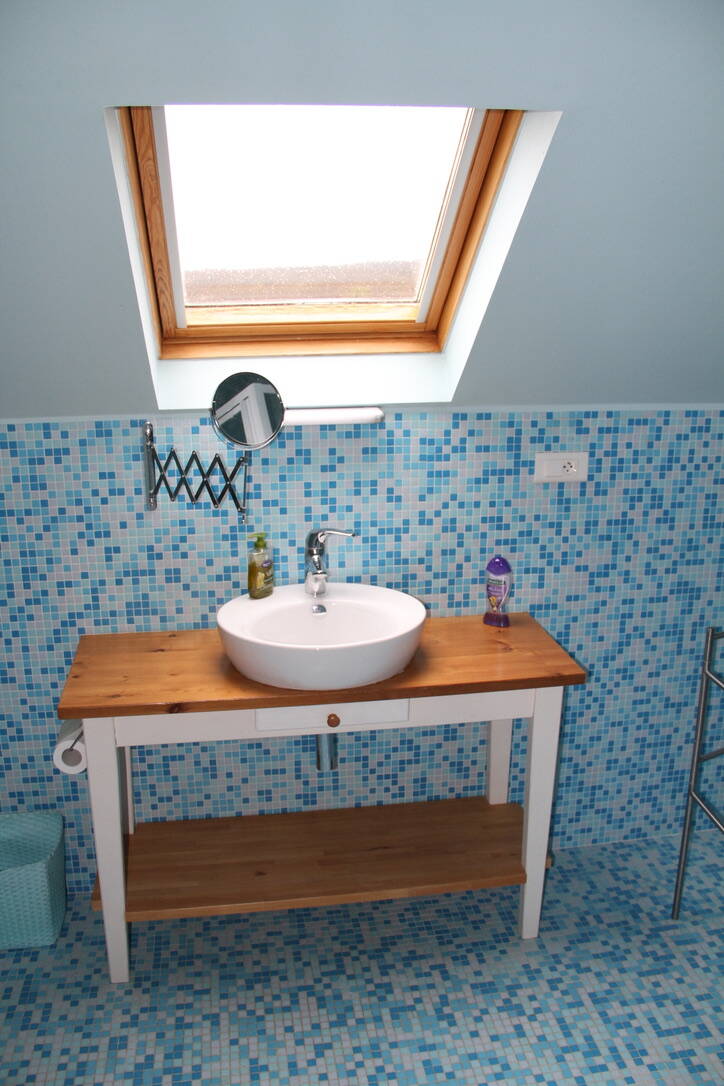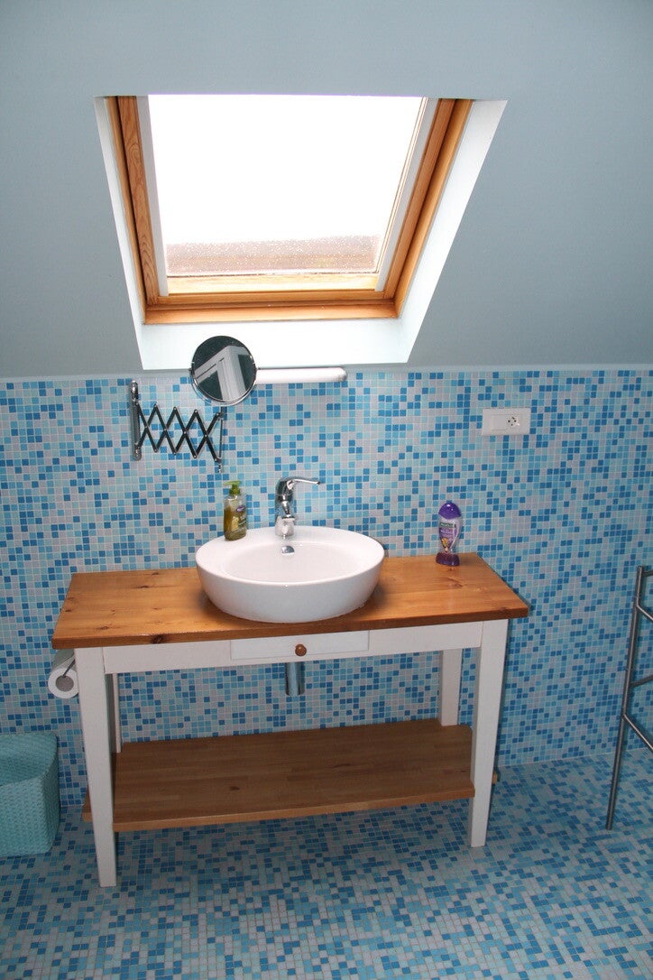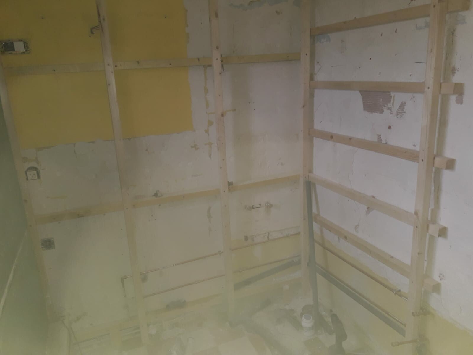 De badkamers waren alles behalve onze smaak, zacht geel en licht blauw. Ook hier maar mee aan de slag!