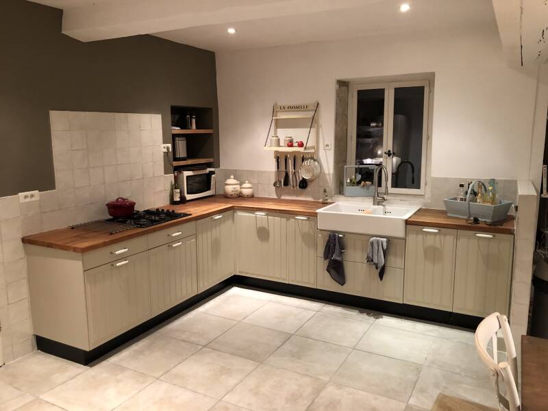 De keuken was best gezellig maar toch niet helemaal naar onze smaak. Een eiland in het midden vonden we niet zo passend omdat we een lange tafel wilden plaatsen met een bijbehorende klepbank. Er moest uiteindelijk flink worden verbouwd want de staande balk weghalen had toch wat voeten in de aarde. Eerst wat foto's van de oude situatie: